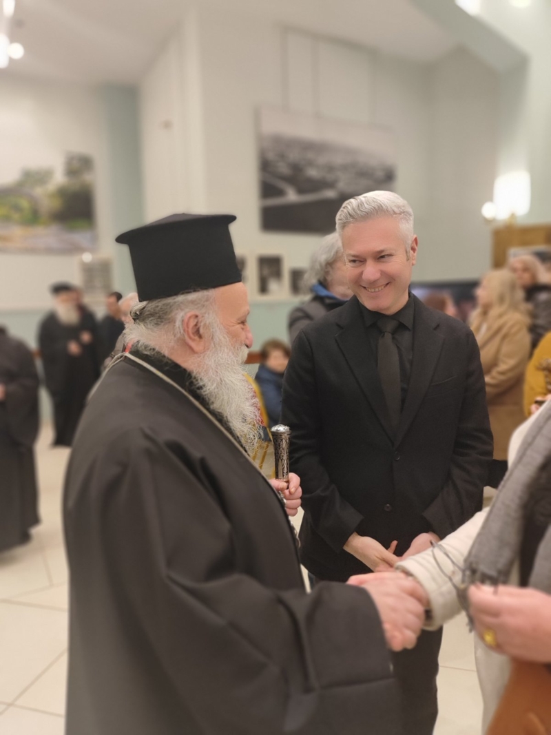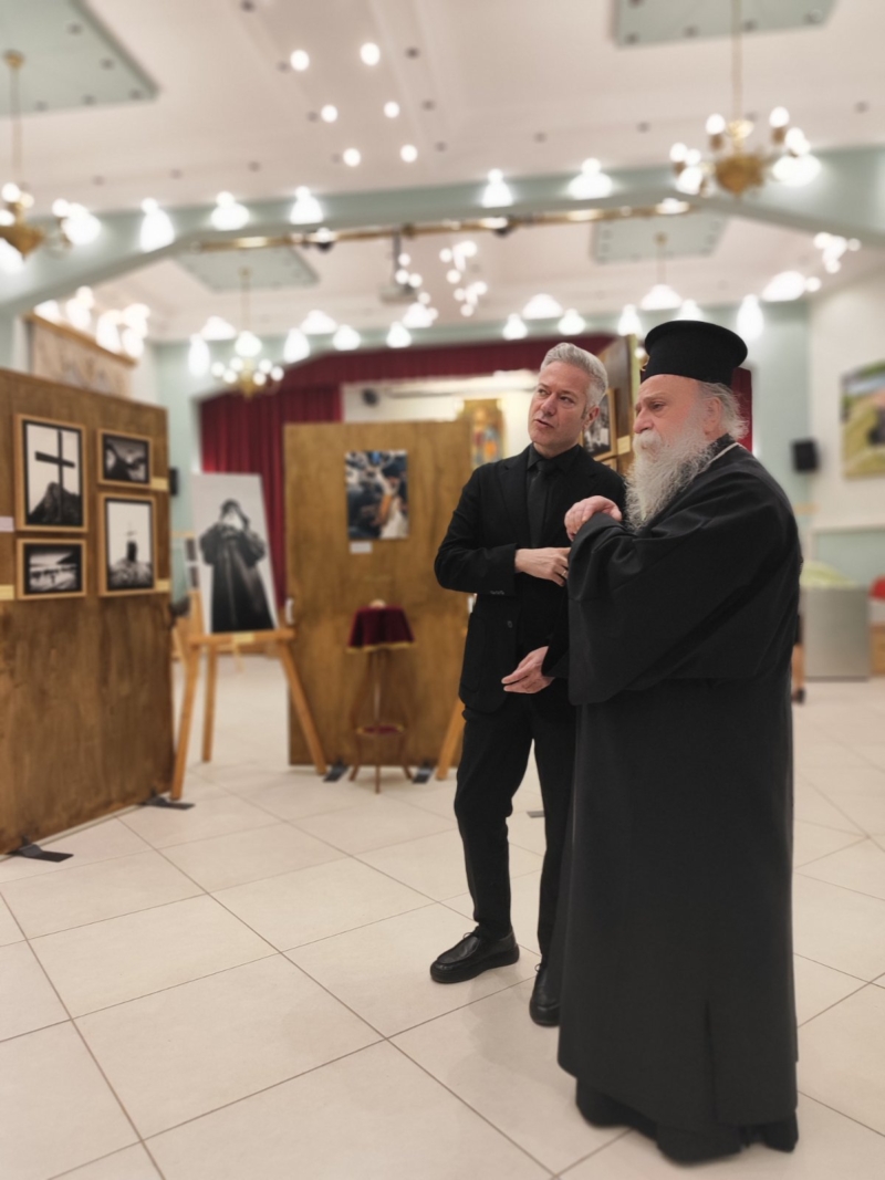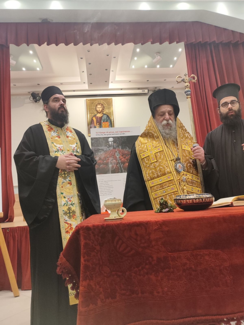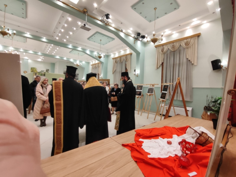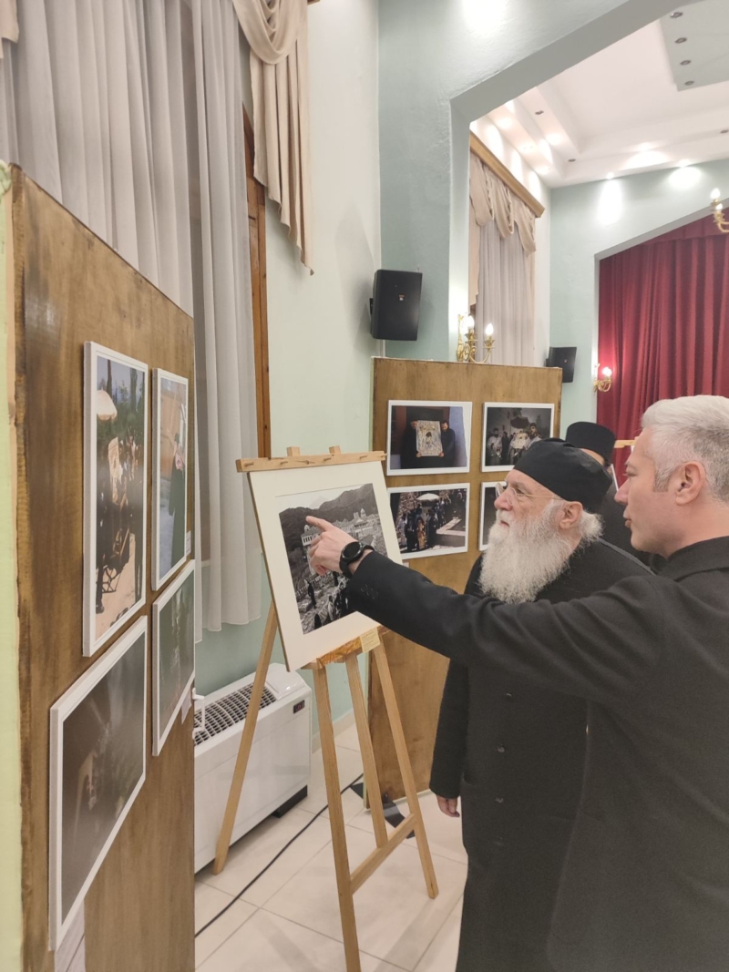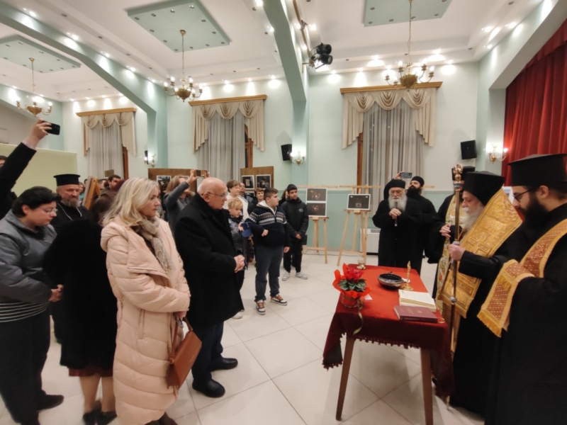 Τον αγιασμό της έναρξης της έκθεσης τέλεσε ο Σεβασμιώτατος Ποιμενάρχης μας, πλαισιούμενος από τον ομιλητή του Κατανυκτικού Εσπερινού, Γέροντας Νεκτάριος Μουλατσιώτης, καθώς και τον Διευθυντή της Αγιορειτική Εστία, κ. Αναστάσιο Ντούρο.