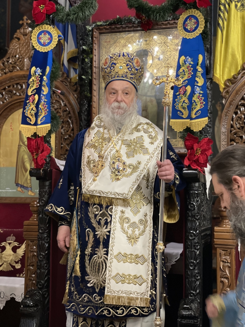 Μετά το πέρας της πανηγυρικής Θείας Λειτουργίας τελέσθηκε η Ακολουθία του Μεγάλου Αγιασμού, κατά την οποία ο Σεβασμιώτατος, στο κήρυγμά του, αναφέρθηκε στο βαθύ θεολογικό νόημα της εορτής των Θεοφανείων, υπογραμμίζοντας ότι με τη Βάπτιση του Κυρίου στον Ιορδάνη ποταμό φανερώνεται στον κόσμο το μυστήριο της Αγίας Τριάδος και αγιάζεται ολόκληρη η κτίση. Τόνισε δε ότι ο αγιασμός των υδάτων αποτελεί πρόσκληση προς τον άνθρωπο να ανανεώσει τη ζωή του εν Χριστώ και να πορευθεί με μετάνοια, πίστη και ελπίδα.