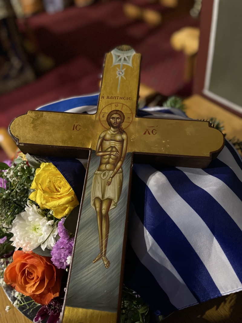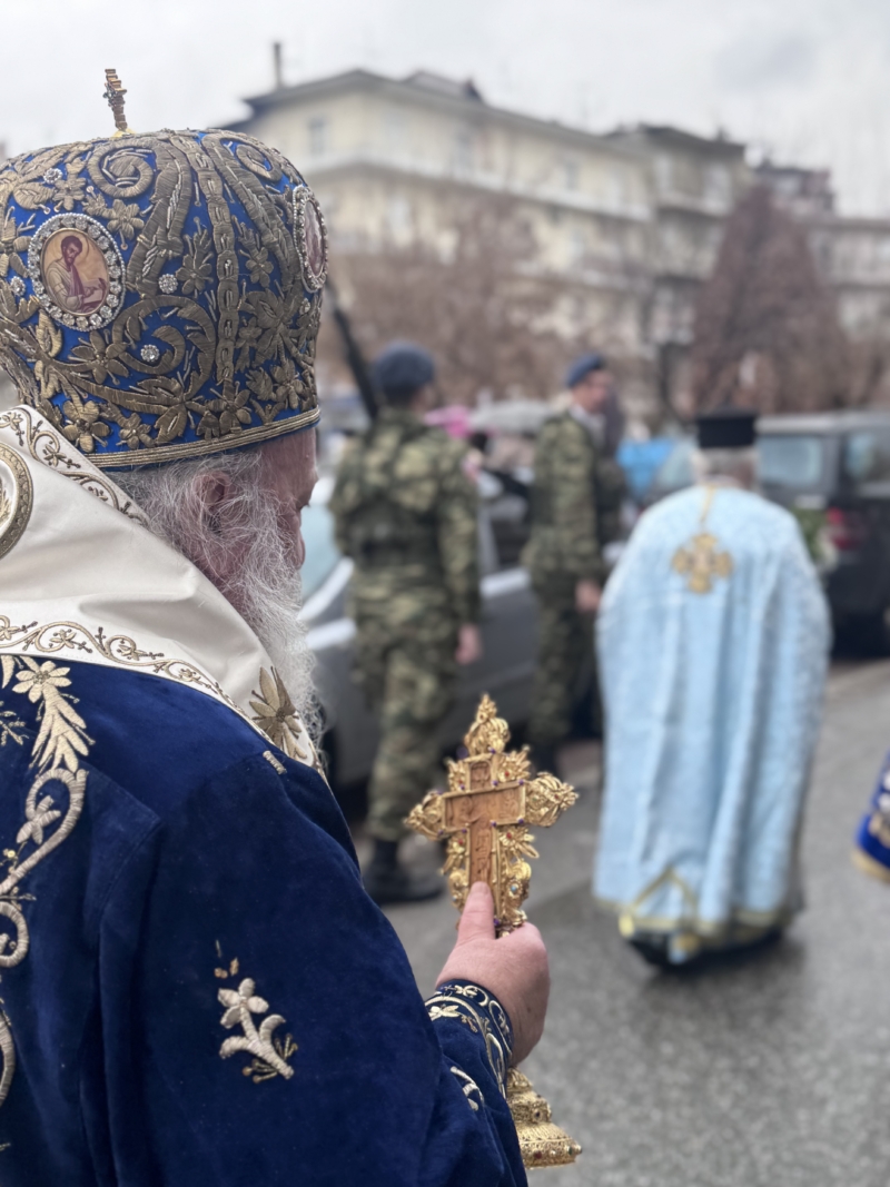 Στη συνέχεια, ο Ποιμενάρχης μας μετέβη στον ποταμό Γρεβενίτη, όπου τελέσθηκε η καθιερωμένη Ακολουθία του Αγιασμού των Υδάτων και πραγματοποιήθηκε η ρίψη του Τιμίου Σταυρού, μέσα σε κλίμα συγκίνησης και πνευματικής χαράς.
